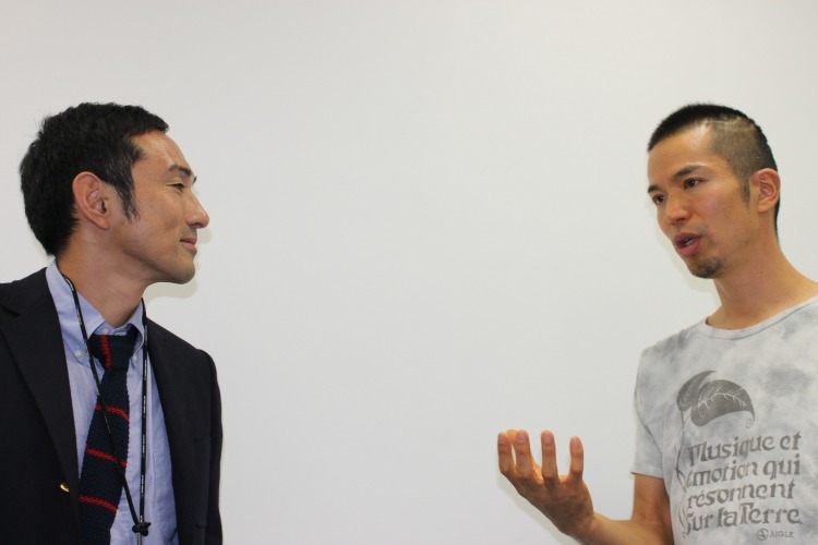 インタビューを受ける、ヤマチク3代目の山崎 彰悟専務