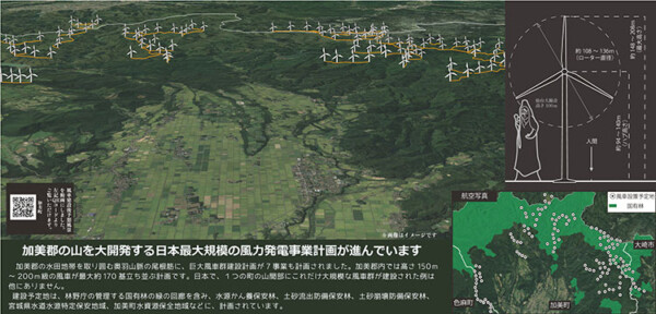 「たとえば宮城県加美郡では、水田地帯を取り囲む奥羽山脈の尾根筋の森を削り、高さ150〜200メートル級の風車が最大約170基建設される計画が進んでいます。この地域に限らず、地元の方たちはこのような再エネ事業の計画を知らず、知った時には森林が伐採されてしまっていたり、山が削られてしまっていたりでもはや手遅れという状況が全国で起きています」