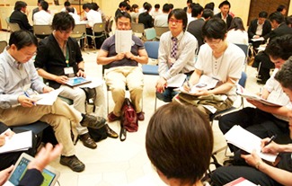 「これから生まれてくる子どもたちのためにも、今、私たち大人の意思表示が求められている」と話す鷹巣さん(写真中央)=2014年4月19日・代々木公園で開催された環境フェス「アースデイ」で
