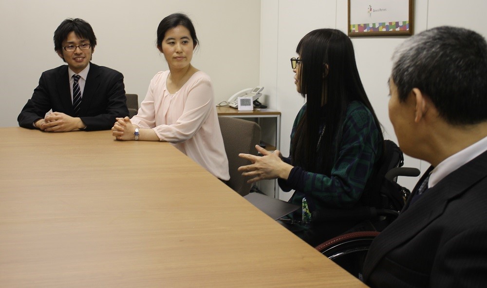 インタビューは、こちらが予め用意した質問をもとに進行しました。自ら話すことが難しいため、坂田さんが「あ、か、さ、た、な…」と50音を読み上げ、言いたい音で恩田さんが頷き、一文字一文字言葉を紡いでいく口文字というコミュニケーション手段で、時折笑顔を見せながら、一つひとつ、丁寧に答えてくださいました。